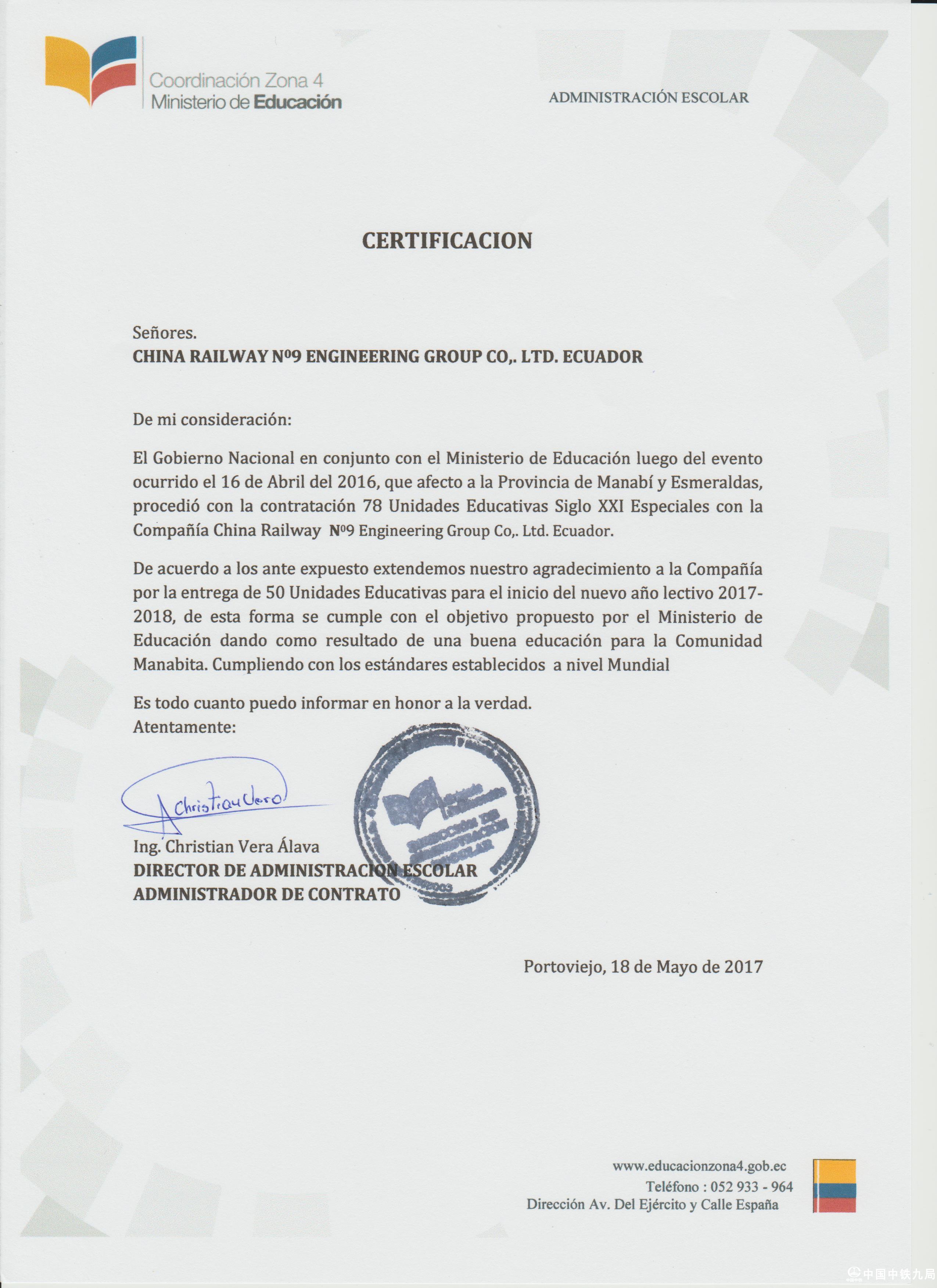 5月18日,厄瓜多尔教育部发来感谢信,感谢我局在新学期开学前保质保量交付50所学校,帮助教育部实现了“为马纳维省人民提供一个世界级标准的教育环境”的目标。